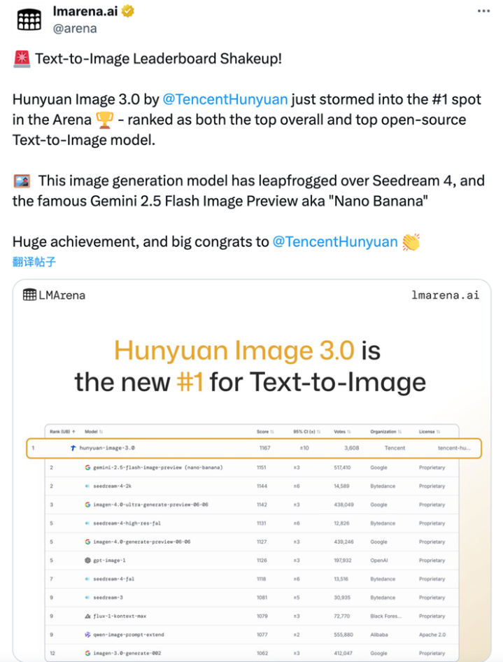 LMArena官方社交平台也第一时间发文祝贺:“文生图排行榜大洗牌!腾讯混元图像3.0登顶竞技场——同时被评为最佳综合文生图模型与最佳开源文生图模型。这款图像生成模型已超越Seedream4,以及代号"nano-banana"的Gemini2.5FlashImagePreview。重大突破,恭喜腾讯混元。”
